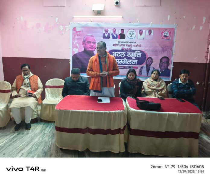 पाकुड़। भारत के पूर्व प्रधानमंत्री और भारत रत्न अटल बिहारी वाजपेयी की जन्म जयंती के अवसर पर आज पाकुड़ में अटल स्मृति सम्मेलन का भव्य आयोजन किया गया। यह कार्यक्रम जिलाध्यक्ष अमृत पांडेय की अध्यक्षता में संपन्न हुआ। सम्मेलन में मुख्य अतिथि के रूप में प्रदेश उपाध्यक्ष सह पूर्व विधायक अशोक भगत की गरिमामयी उपस्थिति रही। कार्यक्रम में बड़ी संख्या में पार्टी पदाधिकारी, कार्यकर्ता एवं गणमान्य नागरिक शामिल हुए, जिससे आयोजन अत्यंत सफल एवं प्रेरणादायी बन गया।