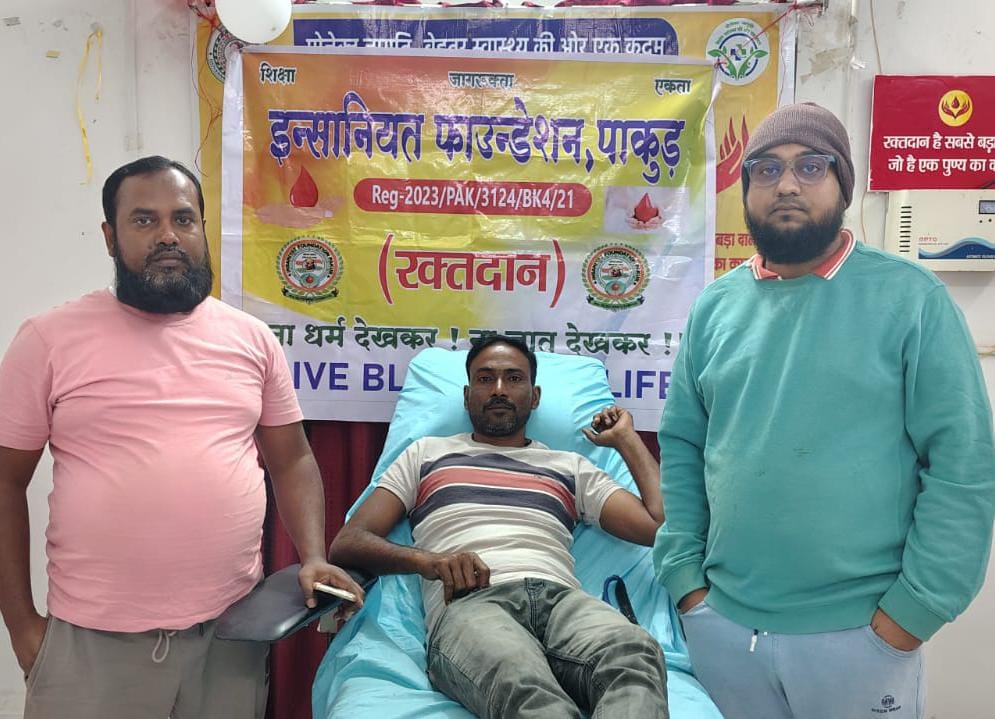 पाकुड़। इंसानियत फाउंडेशन के सदस्य लगातार रक्तदान के क्षेत्र में उल्लेखनीय कार्य कर रहे हैं। यह संगठन झारखंड, बिहार और पश्चिम बंगाल में जरूरतमंदों तक समय पर रक्तदाताओं को पहुँचाकर असहाय मरीजों की मदद कर रहा है, ताकि खून की कमी से किसी भी व्यक्ति की जान न जाए।